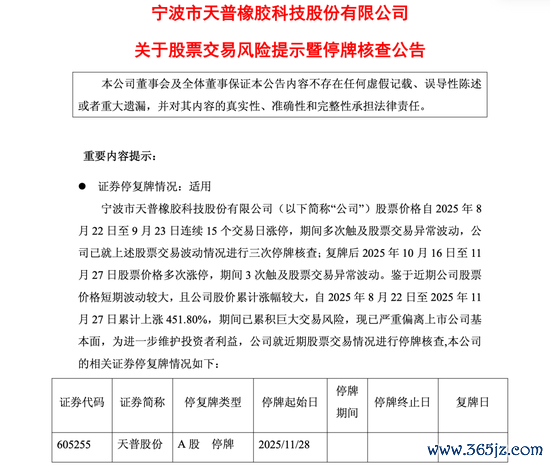 天普股份(605255.SH)11月27日公告称,公司股票价格自2025年8月22日至11月27日累计上涨451.80%,期间多次触及股票交易异常波动,已累积巨大交易风险,股价严重偏离基本面。