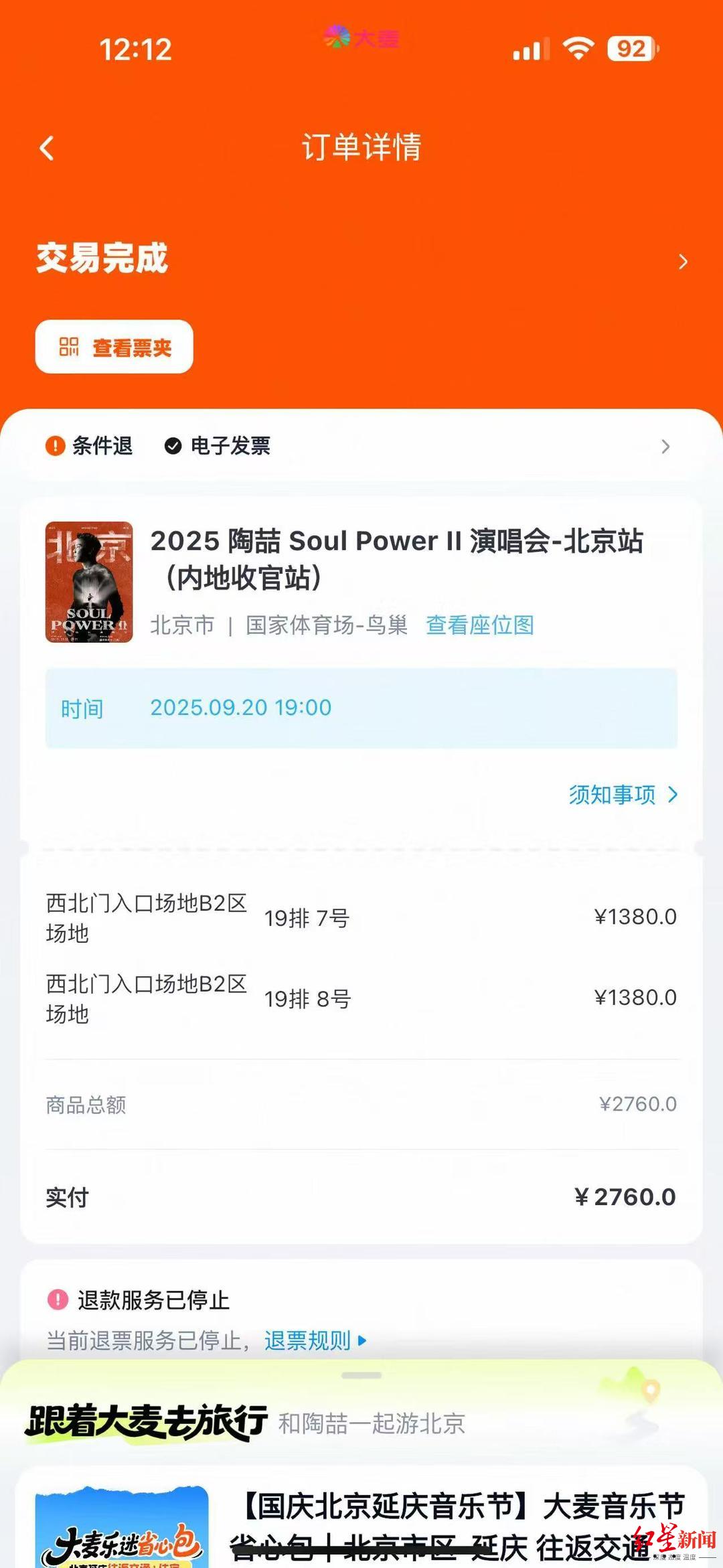 罗女士向红星新闻爆料称,8月15日她以1300多元的单价天通盈,在大麦网购买了9月20日的陶喆演唱会(北京站)门票。